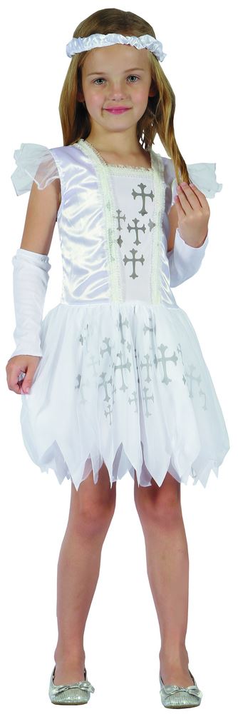 Predivan kostim anđela! Kostim se sastoji od kratke bijele haljinice sa printom križa i slatkim rukavićima od tila. Haljinu nadopunjavaju nastavci za ruke te ukras za glavu.
