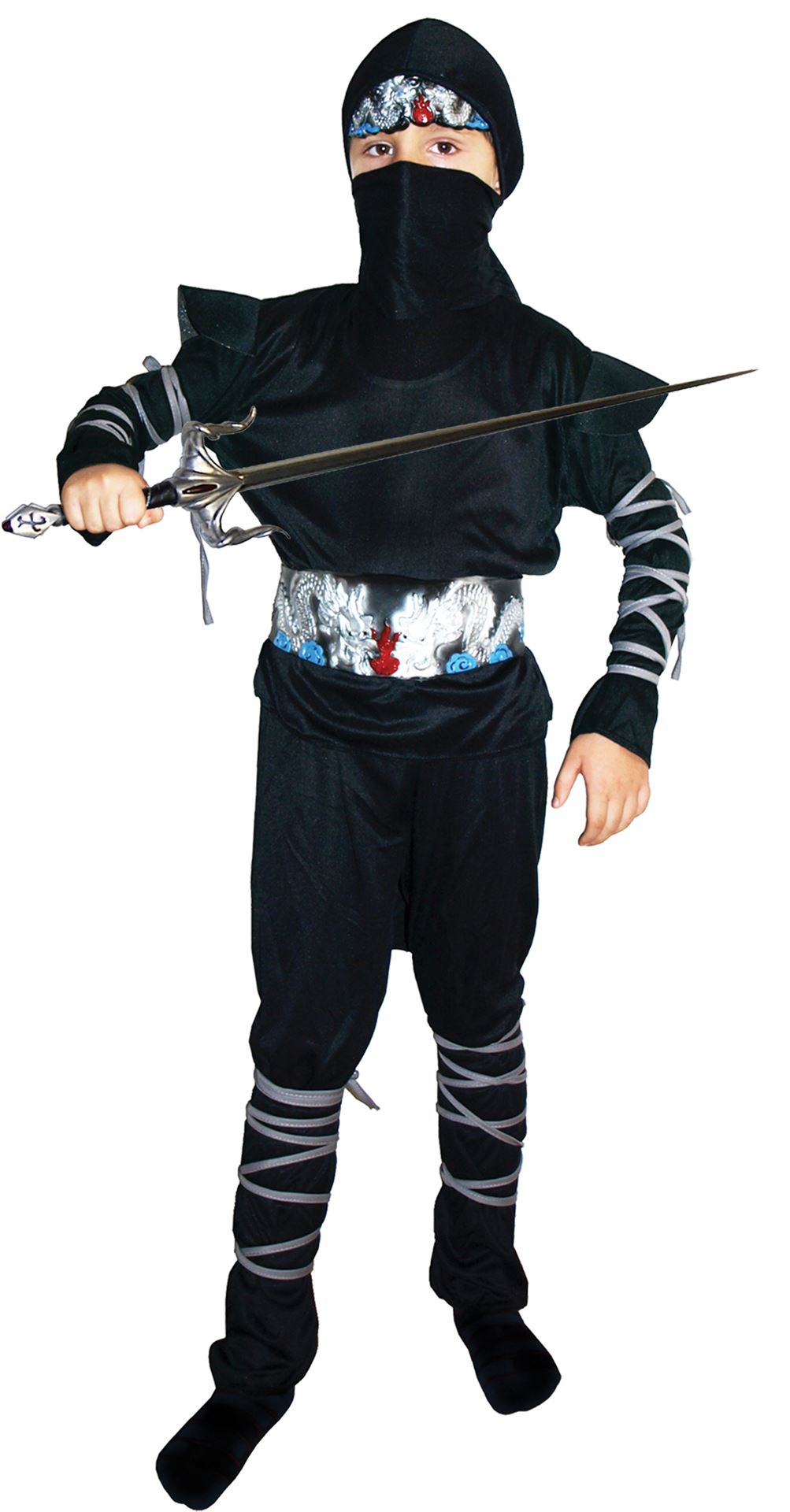 Ne morate brinuti za vlastitu sigurnost ako uz sebe imate ovakvog ninju! Kostim se sastoji od crnog odijela, srebrnog pojasa, kapuljače, poveza za usta, te poveza za ruke i noge.