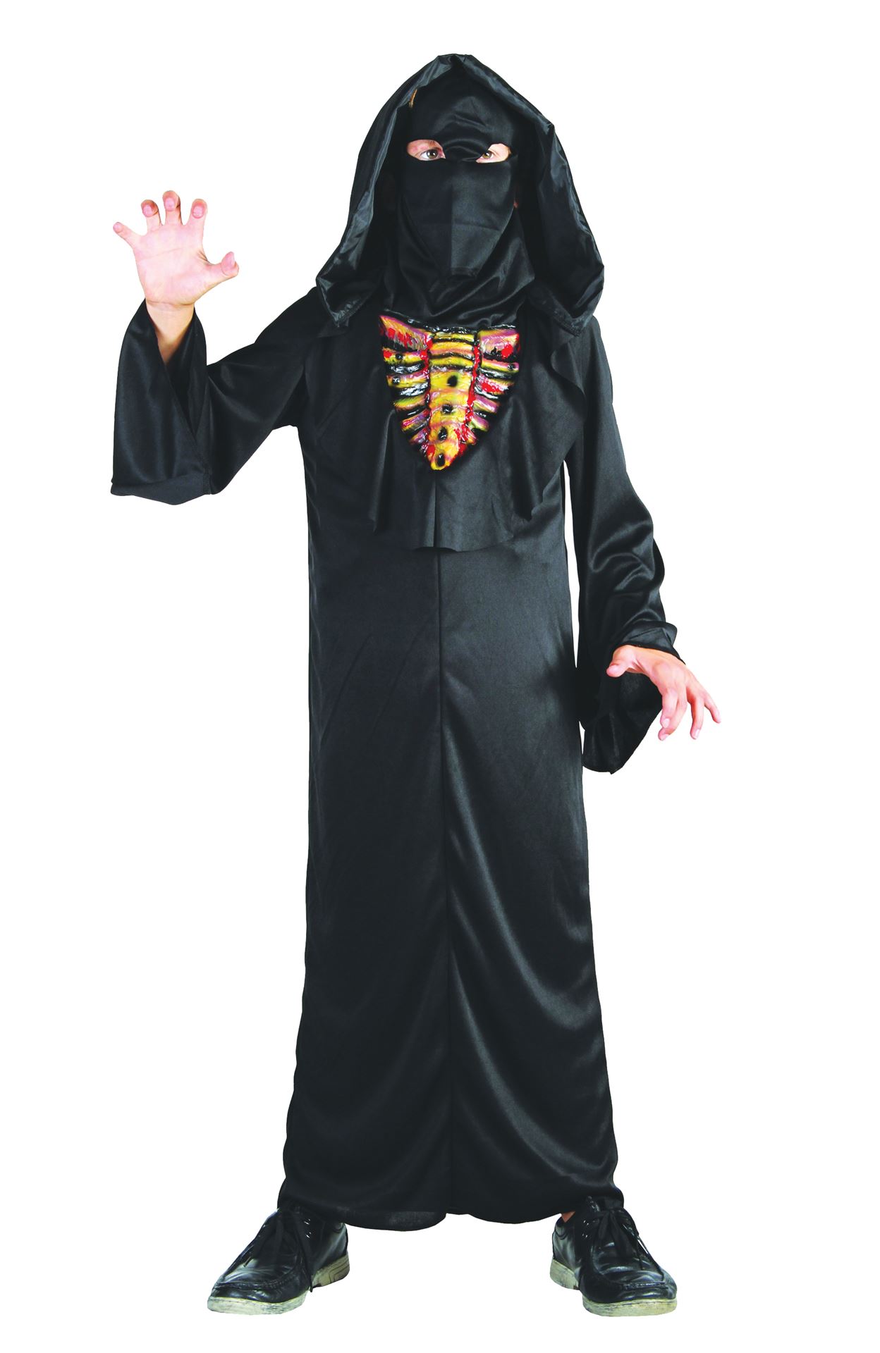 Strašan kostim sastoji se od duge crne toge sa gumenim prsima, kapuljačom i maskom.