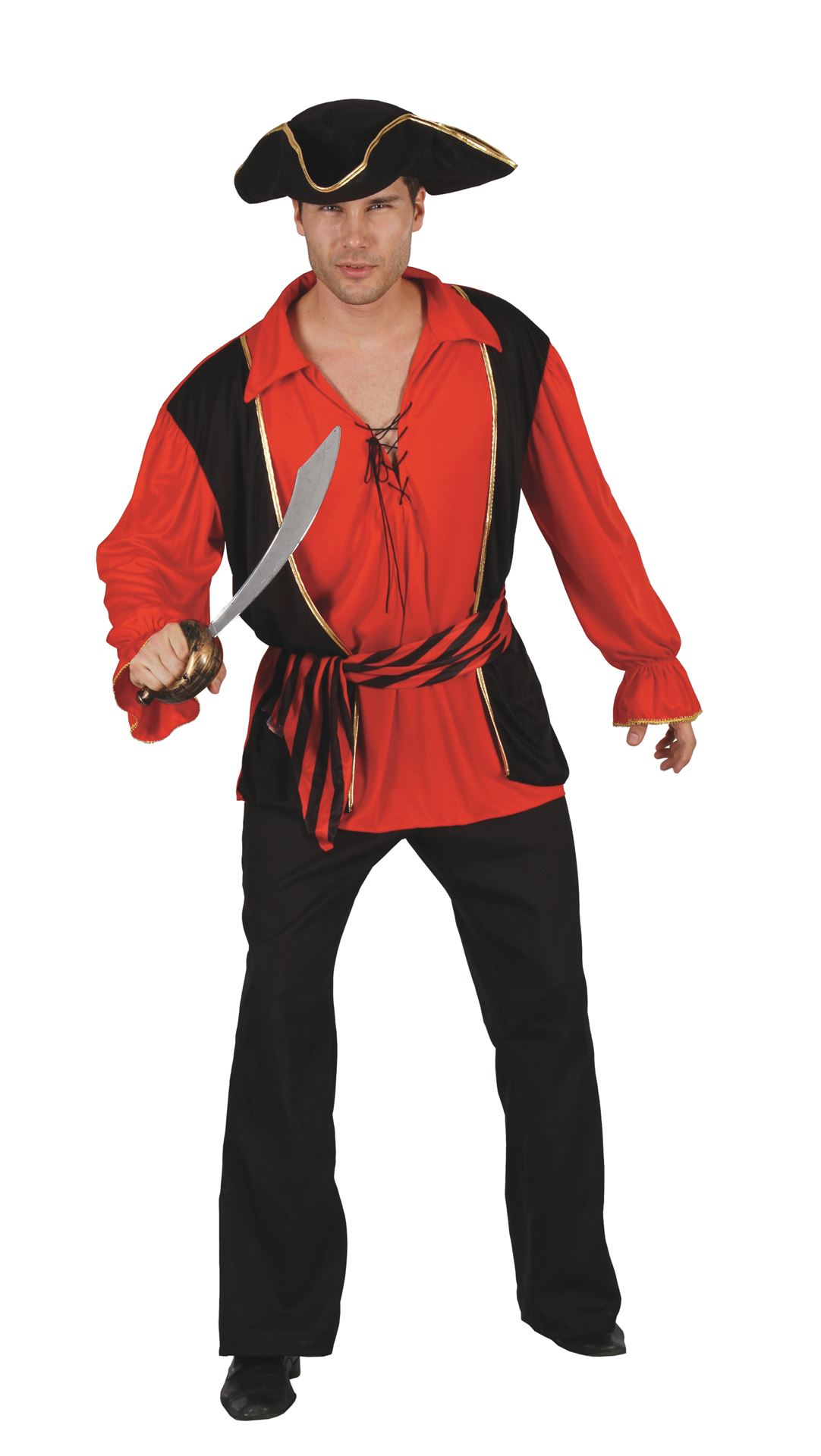 Kostim kapetana uključuje crvenu košulju sa prišivenim crnim prslukom, pojas i šešir.