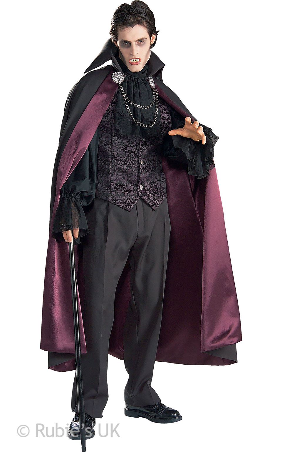Kostim Vampira uključuje prsluk s prišivenim rukavima, plašt s visokim ovratnikom i kopčama s lancem, te dekorativni jabot nabor oko vrata.